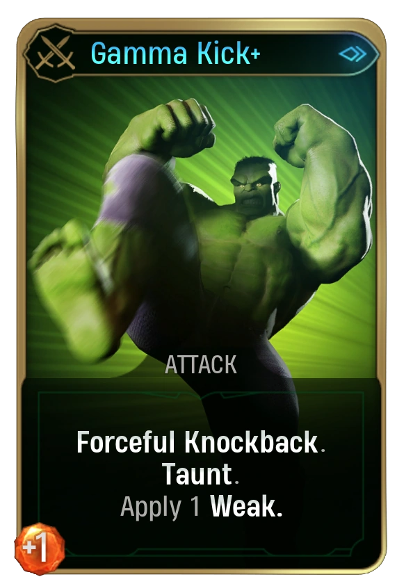 Gamma Kick is a RARE Attack Card used by Hulk in Marvel's Midnight Suns.